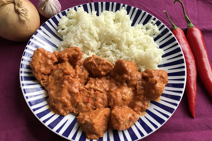 - Blus het geheel met water en laat de kip ongeveer een half uurtje sudderen.