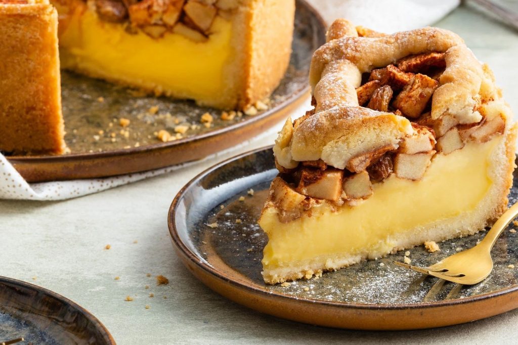 Serveer de appeltaart met vanillepudding in royale punten en geniet van deze hemelse traktatie!