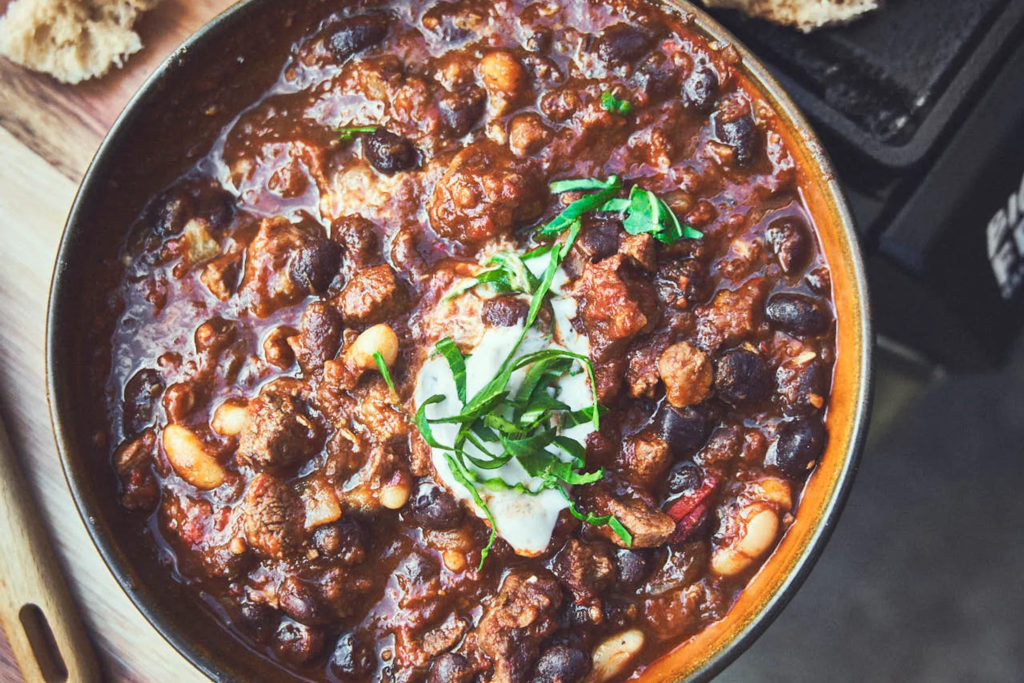 Verdeel de chili con carne over zes koppen, bestrooi met de kaas en maak af met een lepel zure room. Garneer met de takjes koriander en serveer met de maïschips.