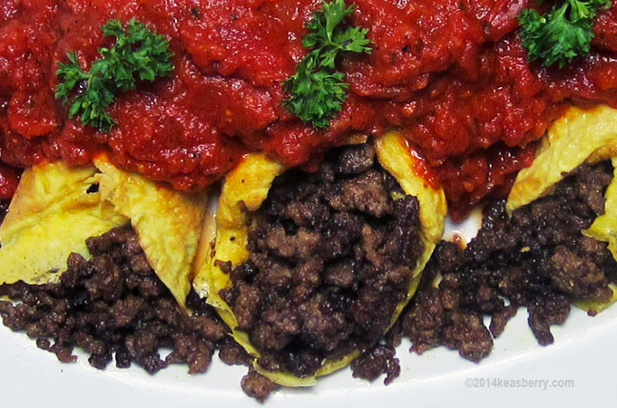 - Schep het gehaktmengsel in het midden van de omelet en vouw de omelet dubbel, of vouw de uiteinden naar elkaar toe.