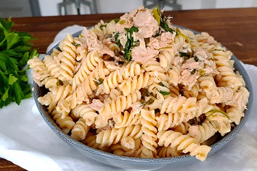 - Voeg de pasta toe aan de tonijn, meng goed en voeg indien nodig wat meer kookwater toe om de saus te verdunnen.