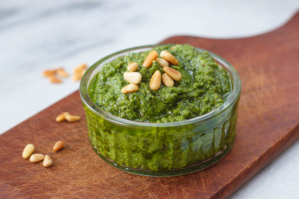 Geniet van deze heerlijke zelfgemaakte groene pesto als smaakvolle toevoeging aan diverse gerechten!