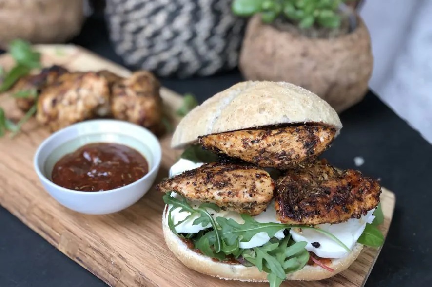 6. Beleg met een handje sla, plakjes mozzarella en de gebakken kip.