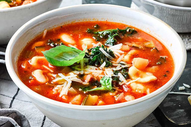 Serveer de soep met wat geraspte kaas er over heen en met stokbrood.