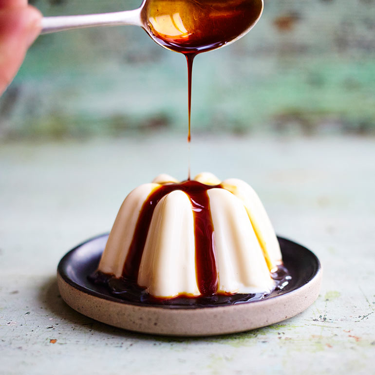 5. Giet het mengsel in 6 panna cotta-vormpjes of stevige glazen en laat het een nacht opstijven in de koelkast.