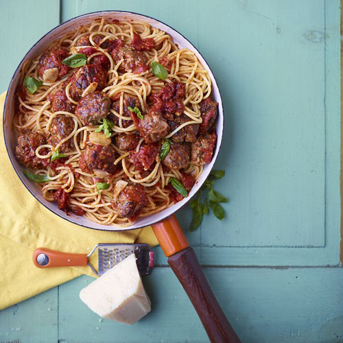 - Kook de spaghetti volgens de instructies op de verpakking. Giet af en roer de pasta door de saus met gehaktballetjes.