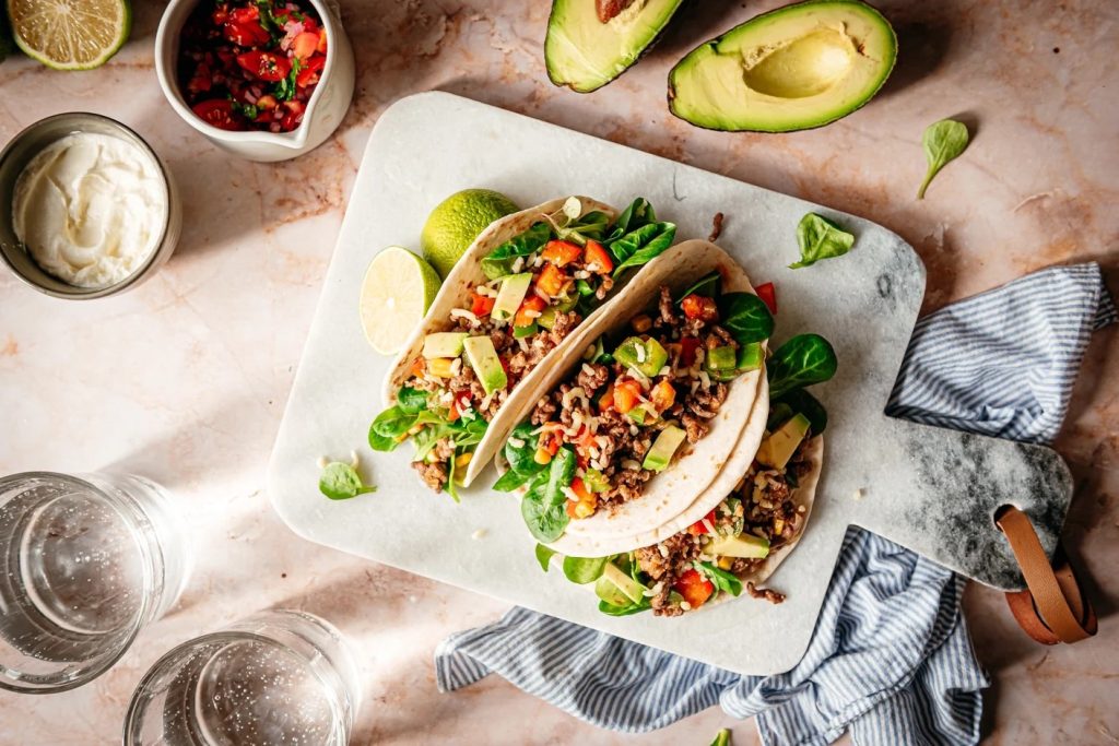 - Beleg de taco’s met het gehaktmengsel, stukjes avocado, zure room, geraspte kaas, verse koriander en limoensap naar smaak.